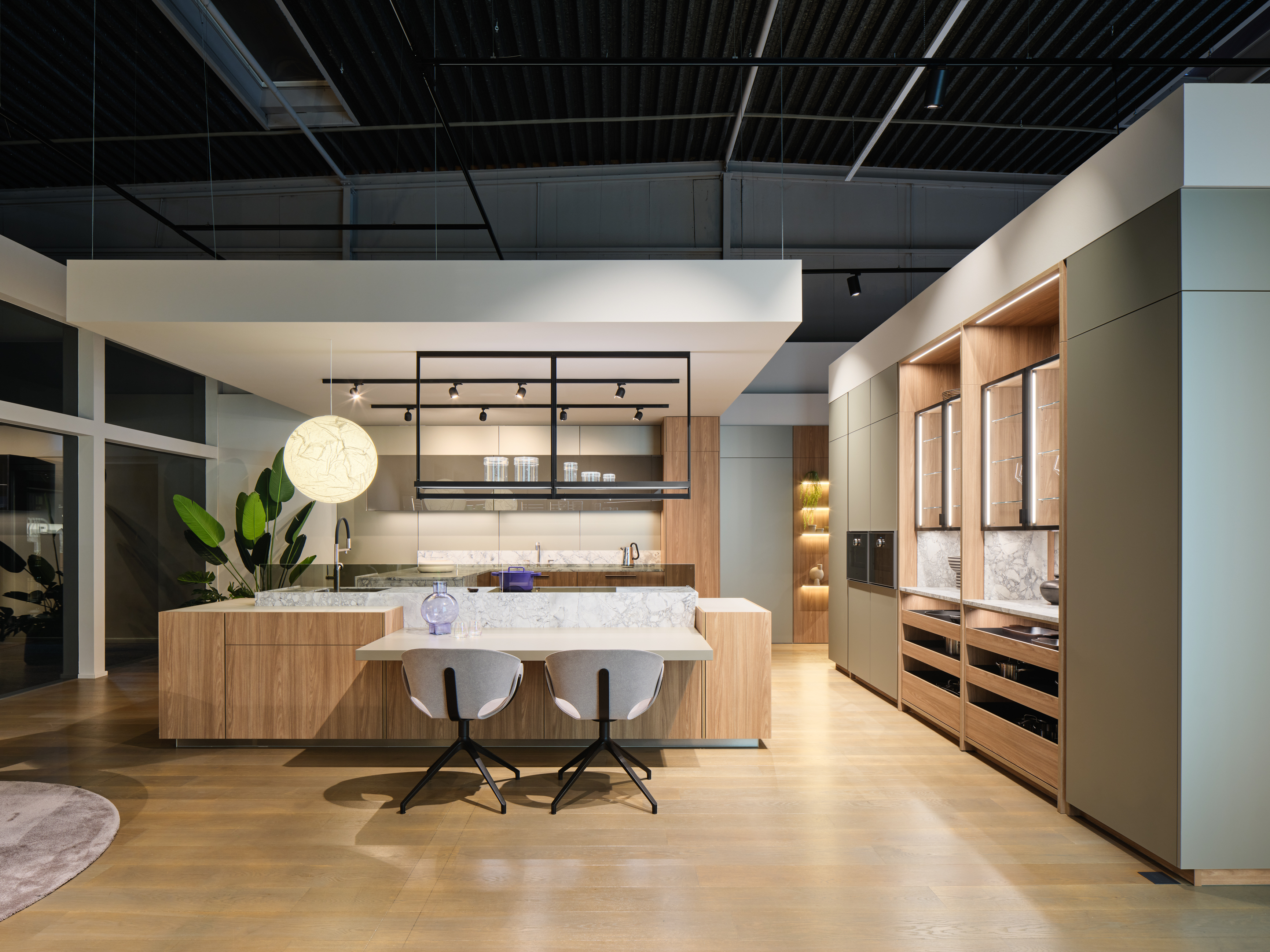 Les matériaux et couleurs soulignent l’architecture de la pièce. Le décor Mélaminé en chêne antique avec les façades lisses Mélaminé donne vie à la façade des meubles. Le bloc îlot central qui marque la transition avec l’espace à vivre est décliné en deux couleurs.